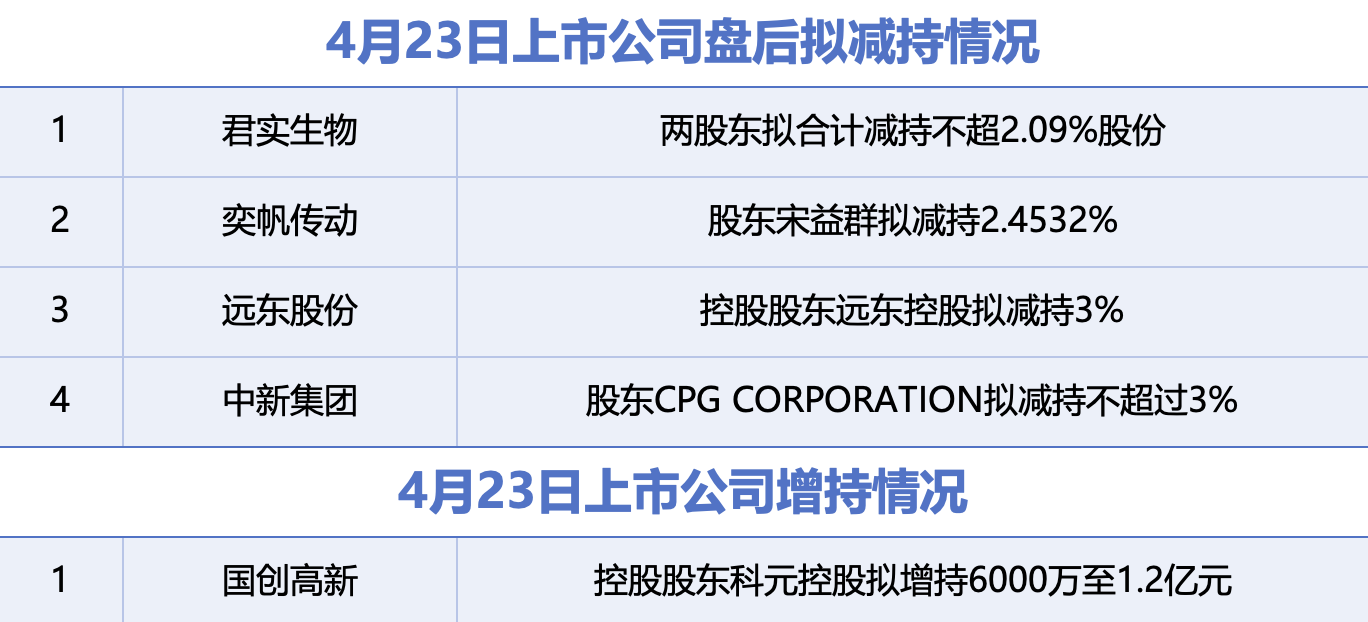 据统计,4月23日,盘后,君实生物、奕帆传动、远东股份、中新集团在内的4家A股上市公司披露拟减持情况。国创高新披露增持情况。