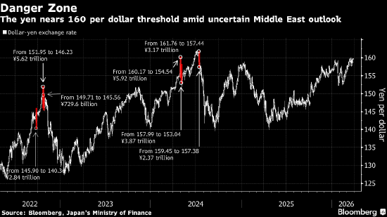 由于中东局势持续紧张,日元跌破1美元兑160日元这一关键水平,加剧了东京当局干预风险。
